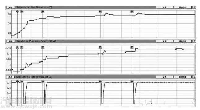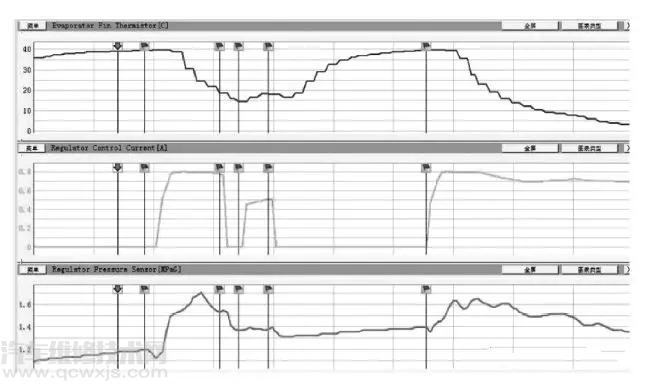 更換空調(diào)壓縮機(jī),換后空調(diào)制冷正常,數(shù)據(jù)也正常,如下圖所示。打開A/C開關(guān),電磁閥電流逐漸增加,空調(diào)系統(tǒng)開始工作,蒸發(fā)箱溫度逐漸下降到7℃,系統(tǒng)恢復(fù)正常工作。