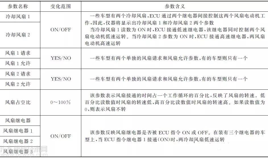 當(dāng)制冷系統(tǒng)高壓側(cè)的壓力開關(guān)觸點(diǎn)閉合時(shí),就會(huì)將信號(hào)輸入發(fā)動(dòng)機(jī)ECU。此時(shí),冷凝器風(fēng)扇控制參數(shù)為ON,其他狀態(tài)下此參數(shù)為OFF。有些車型的汽車空調(diào)系統(tǒng),與空調(diào)風(fēng)扇相關(guān)的參數(shù)還有下表中所列的幾種: