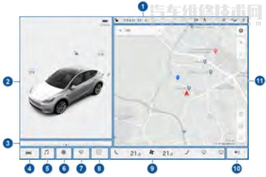 2. 車輛狀態。此區域隨著您駕駛、駐車、開門、開燈等操作而動態顯示 Model Y 的當前狀態。駕駛時應注意觀察此區域,因為它顯示了行駛速度和警報消息等重要信息。當車輛處于駐車模式時,您可以打開行李箱或充電接口蓋板。