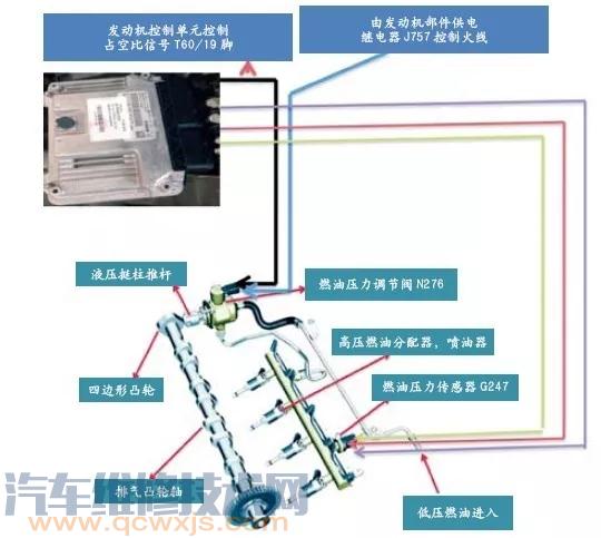 根據(jù)控制原理圖很清楚就知道,高壓油軌的壓力是通過G247的反饋信號(hào)給發(fā)動(dòng)機(jī)控制單元,發(fā)動(dòng)機(jī)控制單元根據(jù)裝在高壓油軌上的高壓燃油壓力傳感器G247所監(jiān)測到的信號(hào)來控制N276以精確調(diào)整占空比,從而得到所需的燃油壓力。