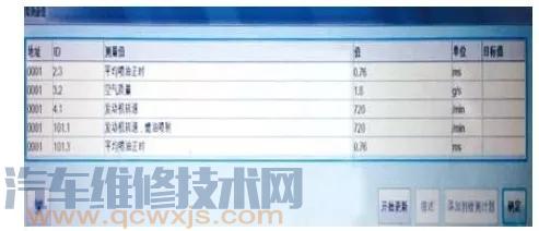 根據(jù)對(duì)比排除機(jī)械方面問題。問題應(yīng)該是在高壓油泵控制系統(tǒng)上面,可能存在的原因:發(fā)動(dòng)機(jī)控制單元、噴油器和油壓傳感器及線路等。根據(jù)從易到難逐一排查,首先清理了線路無異常,更換了油壓傳感器問題沒有解決。根據(jù)經(jīng)驗(yàn)判斷噴油器如果關(guān)閉不嚴(yán)導(dǎo)致泄壓讓發(fā)動(dòng)機(jī)控制單元不停給調(diào)節(jié)信號(hào),會(huì)出現(xiàn)發(fā)動(dòng)機(jī)工作不好且明顯抖動(dòng)故障,這個(gè)車沒有這種現(xiàn)象。讀取了一下噴油器的噴油正時(shí)如圖6所示,正常范圍內(nèi)沒有異常。