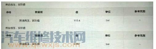 重新固定搭鐵點后試車,發動機能正常啟動,加速沒有頓挫感,行車電腦不再顯示發動機啟停系統故障。讀取高、低壓數據流,高壓為115.4bar,低壓為6.987bar,油壓正常,如圖7所示。至此,該車故障被徹底排除。