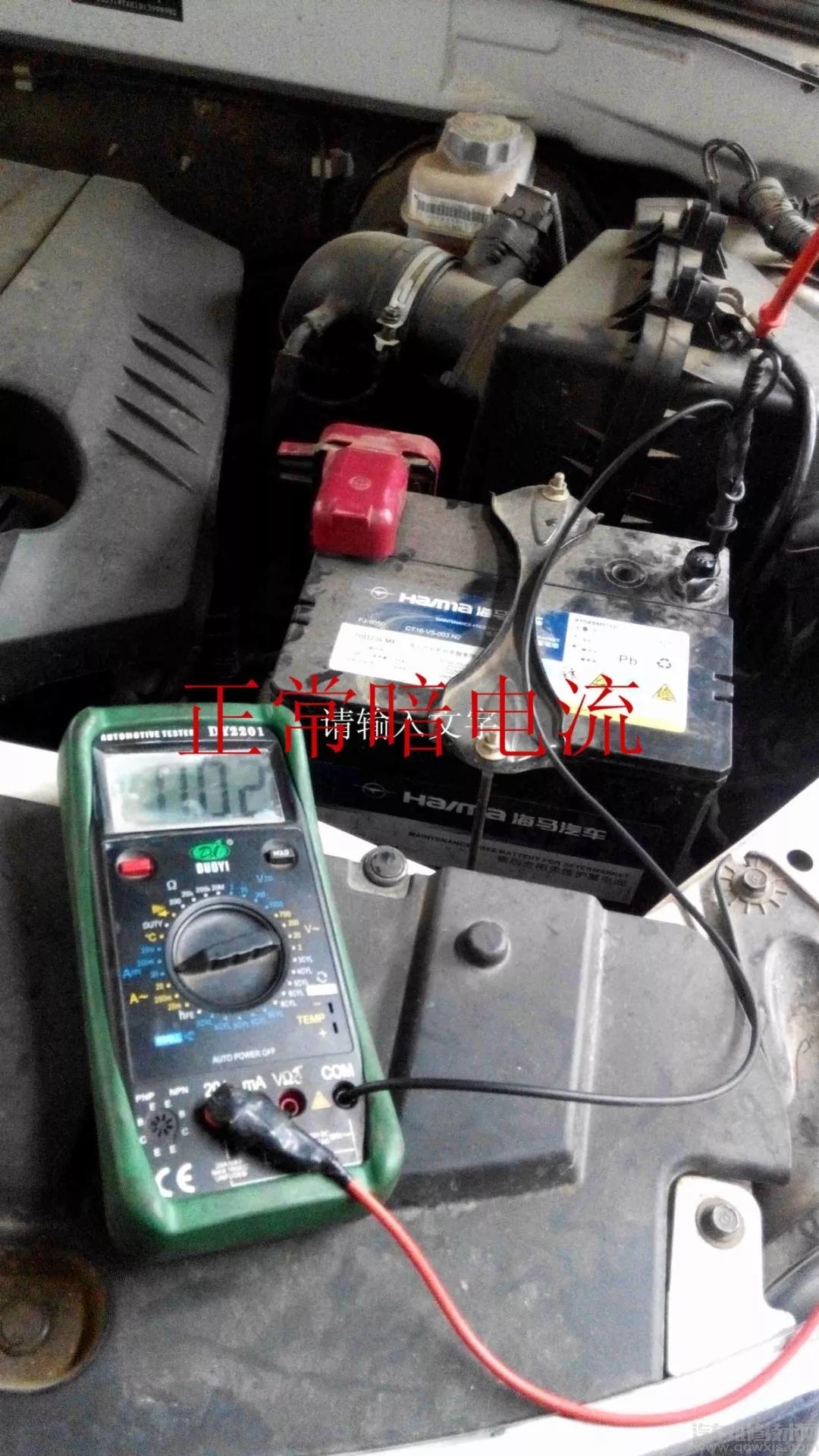 檢測車子的暗電流。用遙控器鎖門,等待5分鐘以上,這步一定做,等待車載網絡進入休眠狀態,觀察電流,發現有時20毫安,有時200毫安。說明車子有放電的情況。
