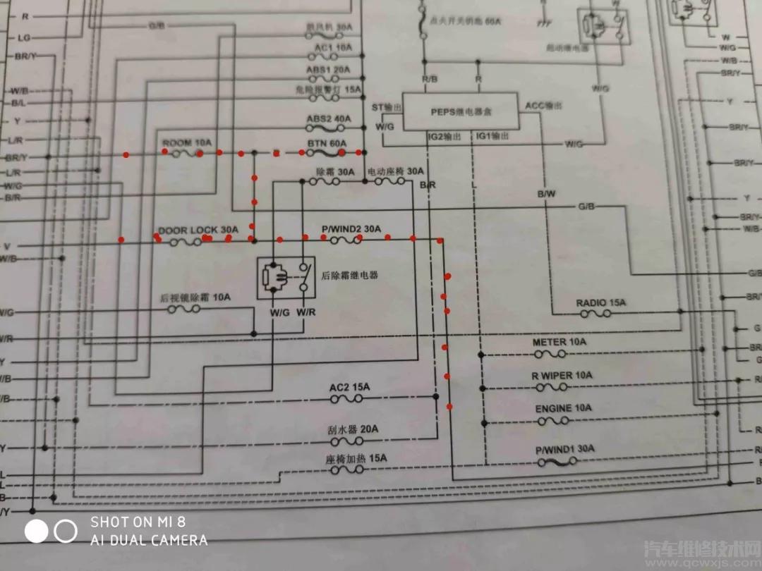 斷開機艙的保險絲盒的BTN60安的保險,電流正常。分析車子電路圖,BTN 保險絲控制中控鎖,玻璃升降,室內燈,音響,