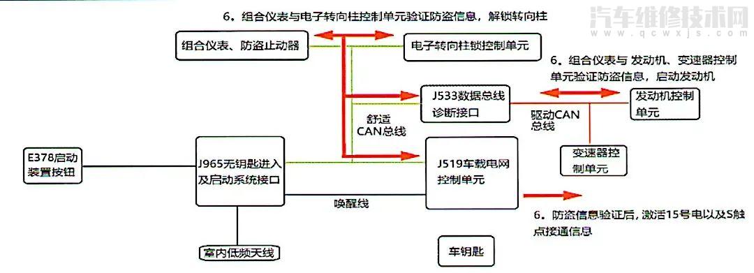 故障診斷:邁騰B8L車型全系標配無鑰匙啟動系統,用戶攜帶合法鑰匙進入車內,輕按中控操作臺上的啟動裝置按鈕即可實現電子轉向柱鎖解鎖、S觸點激活、接通開點火開關、啟動發動機等功能。因為無法接通點火開關,利用診斷儀進行自診斷檢查較為困難,所有先從無鑰匙啟動系統的工作原理入手分析故障部位。無鑰匙啟動系統線路圖如圖1所示。無鑰匙啟動工作過程是按壓E378啟動裝置按鈕,J965的T40/7,T40/19兩腳電位被拉低至0V。無鑰匙進入及啟動接口控制單元收到 “啟動裝置按鈕按下”信息后,通過舒適CAN總線把該信息發送給組合儀表中的防盜止動器控制單元,如圖2所示。組合儀表通過舒適CAN總線發出防盜驗證請求信息給J965,J965通過車內天線發出頻率為125kHz的低頻信號給車鑰匙,如果J519處于休眠狀態,通過T40/26腳的喚醒線,喚醒車載電網控制單元,如圖3所示。車鑰匙被低頻信號激活,鑰匙防盜信息通過433MHz的高頻信號發給J519,車載電網控制單元通過舒適CAN總線把鑰匙信息發送給組合儀表,如圖4所示。組合儀表收到信息后,與電子轉向柱鎖控制單元驗證防盜信息。通過驗證后,解鎖電子轉向柱。J519激活15號電,通過舒適CAN總線發出“S觸點接通”信息。組合儀表通詢533數據總線接口控制單元,與驅動CAN總線系統的發動機及變速器控制單元驗證通過防盜信息后,如制動踏板已經踩下,則可以啟動發動機,如圖5所示。三、診斷過程