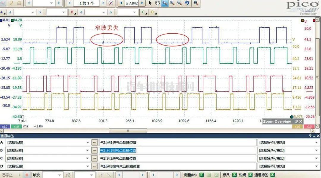 對調(diào)安裝2個進氣凸輪軸位置傳感器后再次測量4個凸輪軸位置傳感器的信號波形(圖4),發(fā)現(xiàn)氣缸列1進氣凸輪軸位置傳感器的2個窄波信號徹底丟失了,由此推斷該進氣凸輪軸位置傳感器損壞。