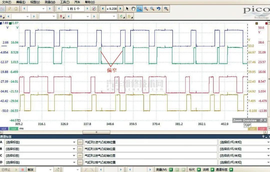 根據(jù)故障代碼提示,首先用pico示波器同時測量氣缸列1、氣缸列2的進氣、排氣凸輪軸位置傳感器信號波形(圖3),對比發(fā)現(xiàn)2個進氣凸輪軸位置傳感器信號的相位基本一致,2個排氣凸輪軸位置傳感器信號的相位也基本一致,由此推斷4個凸輪軸的相對位置正確。