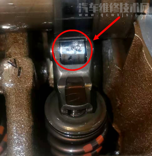更換火花塞,高壓包、噴油嘴對調檢查,故障依舊,發動機電腦板編程、點火線圈線路排除、缸壓檢測等都沒有問題,最后拆解檢查發現4缸凸輪軸搖臂軸軸承有明顯破損情況,如下圖:
