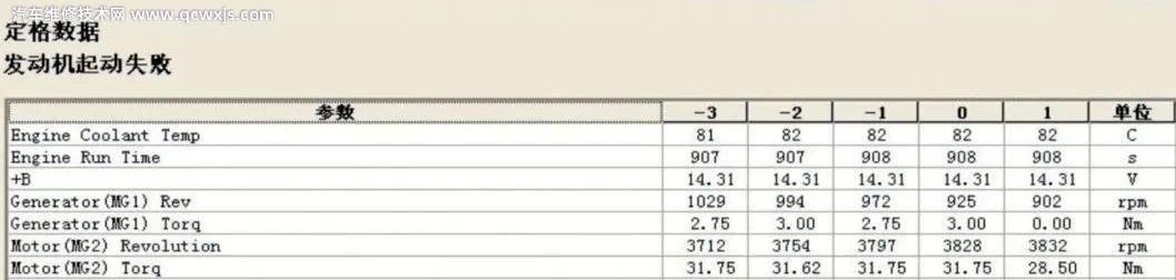 故障車輛是混合動力車型,用戶反映車輛行駛中有時會突然失去動力,甚至熄火,重新起動后,發動機又恢復正常。連接診斷儀,讀取到“發動機起動失敗”的故障記錄。查看凍結幀數據,該故障只出現過一次。由此可見,問題應該出在發動機上,分析故障原因是當混合動力系統的動力電池電量降低,此時發動機應起動接入動力,卻出現了起動失敗的情況,造成車輛失去動力。
