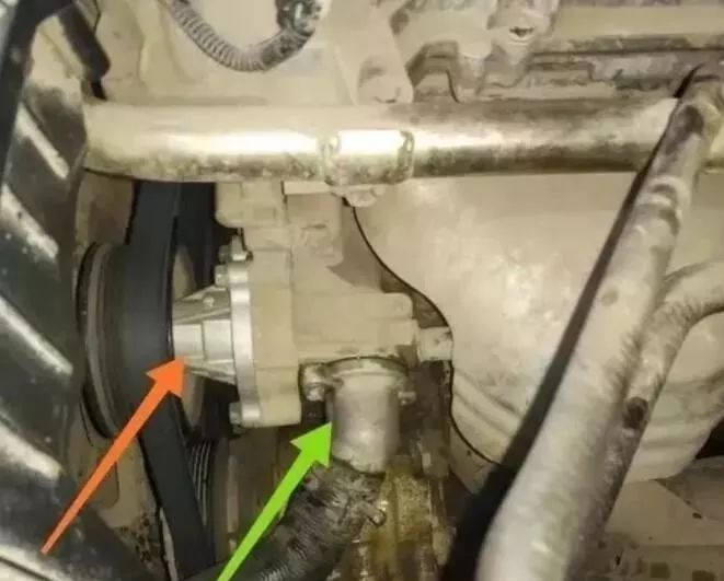 師傅先打開發(fā)動機艙,然后啟動發(fā)動機檢查。一開始,散熱風扇不轉,幾分鐘后,風扇就高速運轉。下圖橙色箭頭所示,水泵是車主剛換不久,綠色區(qū)域所示的是節(jié)溫器位置。