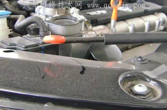 故障處理方法:將機蓋撐竿的弧度進行調整使它與前圍之間有2CM左右的間隙,并且用海綿和膠帶對機蓋撐桿的前端進行包扎,使它與前圍支架之間不再直接接觸。qcwxjs.coM專用工具/設備: