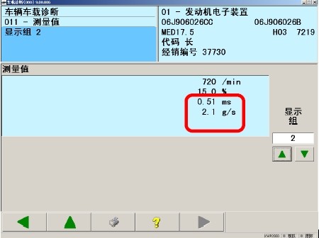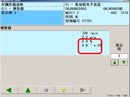 傳感器雖然會影響發動機扭矩調節;但對啟動和怠速時的混合氣調節影響關系不大;00370氣缸列1燃油調整系統 過濃,從代碼含義說明混合氣處于較濃狀態;00769 1缸檢測到不發火系偶發故障;以上故障代碼無法判斷故障實際狀態如何,繼續采集怠速混合氣狀態關鍵數據進行分析。
