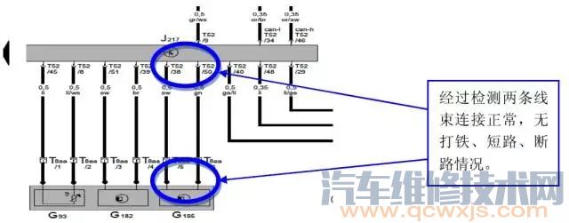 2、讀取數(shù)據(jù)流檢查G195信號(hào),有輸出信號(hào)。將故障清除后試車,故障依舊存在。查看資料得知:當(dāng)G195 出現(xiàn)故障時(shí)電腦將采用車速信號(hào)代替G195,所以通過數(shù)據(jù)流看到的有可能是代替信號(hào)。 3、測(cè)量G195傳感器插頭T8aa/5、T8aa/6電壓12V,檢測(cè)此插腳和變速箱電腦的連接正常。