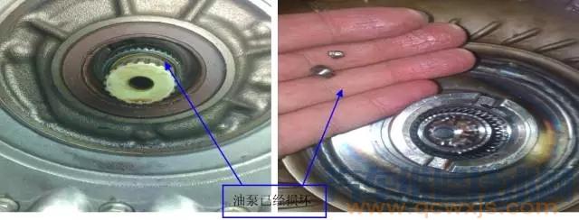 5、仔細(xì)回想安裝變速箱過程,在安裝時(shí)曾出現(xiàn)過“咔”響聲。這就更證明以上的分析是有道理的,將變速箱拆下后發(fā)現(xiàn)變速箱油泵損壞。