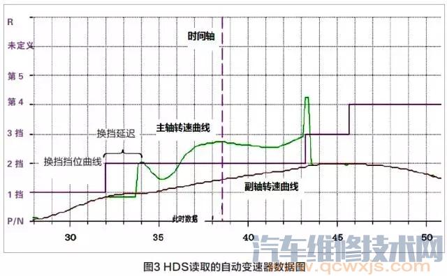 看來電腦所記錄的故障碼只是個偽碼。至此筆者重新整理 維修思路,為了能找出原因,利用本田HDS 系統進行動態測試 功能進行試車,調取“主軸轉速”、“副軸轉速”和“換擋控制”3 個參數組得出的數據圖如圖3 所示,看出變速器從1 到2 換擋 時有明顯的換擋延遲,所以產生換擋沖擊問題。同時也圖中看 出主軸和副軸轉速在2、3 擋時差距很大,進入4 擋后趨于同步。 由此看來該變速器是可以進行換擋,現懷疑是由于電磁閥工作 不良或者換擋油路上存在問題,才引起變速器起步換擋延遲沖 擊的故障。