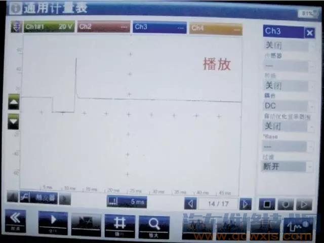 測量1缸點火線圈初級部分的波形(圖4),與其他缸的波形一致。將1、4缸噴油器對調后試車,故障依舊。測量1缸噴油器控制信號的波形(圖5),與其他缸的一致。