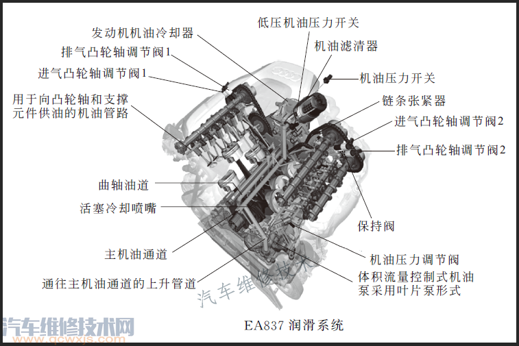 EA837 3.0T V6發動機機油壓力紅燈報警,診斷儀檢查有P164B或P164D故障碼。P164B:機油壓力開關失靈,機油泵的額定壓力水平和高壓機油壓力開關的額定壓力水平可能過于接近,這可能會導致開關頻率增加,由此生成故障碼P164B。P164D:低壓機油壓力開關失靈,在極個別情況下,安裝機油濾清器濾芯時扭轉了濾芯,因此導致排油閥短時沒有正確閉合,以及沒有達到所需的機油壓力(低壓)。