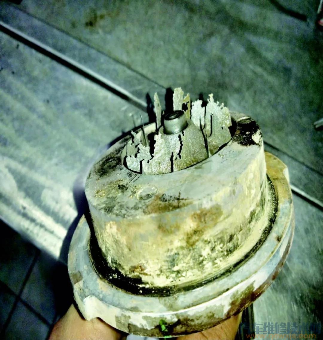 如果汽缸墊上有水氣道的話,汽缸做功的燃氣會源源不斷地進入冷卻水道,將會導致發動機持續高溫和冷卻液的大量缺失,而故障車并沒有持續高溫也不缺失冷卻液。看來故障車冷卻液污染最大的可能是由于發動機缸體水道和水泵葉輪,將冷卻液放出來檢查發現冷卻液表面漂浮像鐵銹一樣的物質,懷疑是機體水道腐蝕或者水泵腐蝕后的銹蝕物,拆卸冷卻水管接口透過安裝軸承孔對缸體進行檢查,沒有發現銹蝕現象。