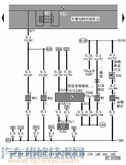 照明燈系統。首先斷開雜物箱照明燈開關插頭,測量B150接點電壓,仍有5~9V變化電壓;再拆掉后備行李箱照明燈,測量B150接點,發現沒有電壓,確定故障應出在后備行李箱照明燈上。