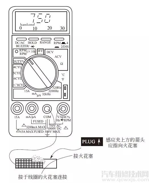按下圖所示的方法連接萬用表,用測(cè)試鉗5夾住點(diǎn)火高壓線,注意測(cè)試鉗的符號(hào)“←”朝火花塞,對(duì)于無分電器點(diǎn)火系統(tǒng),符號(hào)“←”朝向點(diǎn)火線圈。