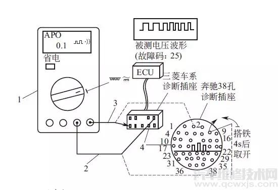 按下圖所示的方法接好萬用表。紅表筆接隨車診斷插座的信號(hào)輸出端,黑表筆搭鐵,轉(zhuǎn)換開關(guān)轉(zhuǎn)到“故障碼測(cè)試”擋,以測(cè)方形故障波。