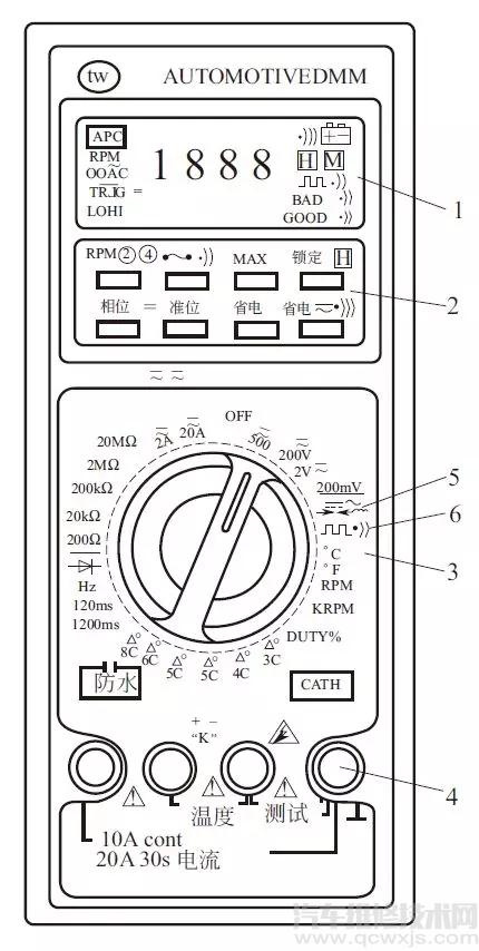 1—液晶顯示器;2—功能鍵;3—轉(zhuǎn)換開關(guān);4—測(cè)試線插孔;5—測(cè)試發(fā)電機(jī)二極管、氧傳感器和高壓線漏電擋;6—故障碼測(cè)試擋