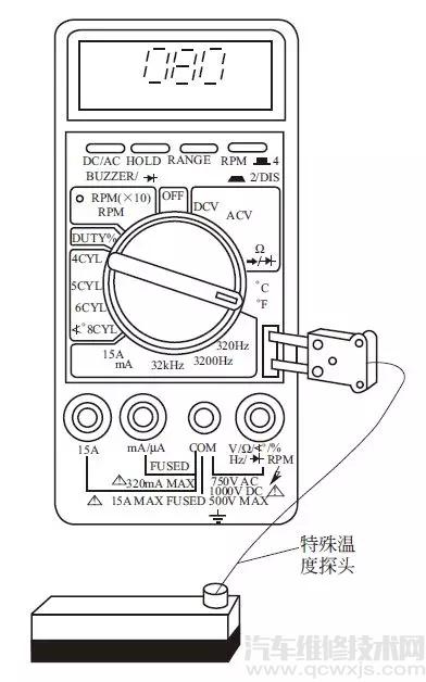 ◆ 將汽車萬用表配備的帶測(cè)針的特殊插頭,插接到面板上黃色插孔內(nèi),測(cè)針與被測(cè)溫度的部位接觸▼
