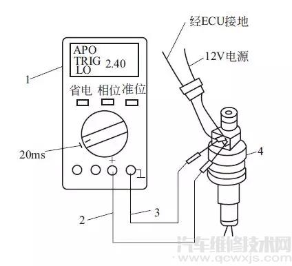 按下圖所示的方法連接萬用表和噴油器,紅表筆接噴油器電源接線柱,黑表筆接噴油器的ECU 接線柱,轉(zhuǎn)換開關(guān)在20ms擋。