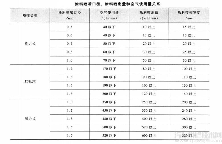 噴槍的性能取決于涂料噴出量與空氣消耗量的關系,即涂料噴出量小而空氣消耗量大時涂粒較小,而涂料噴出量多而空氣消耗量少時涂粒較大、較粗,涂面的成效較差。通常,小型噴槍涂料噴出量為l0~200ml/min,大型為120~600mL/min,空氣使用量小型為40-290L/min,大型為280~520L/min。涂料噴出量大,則空氣使用量也須越大。