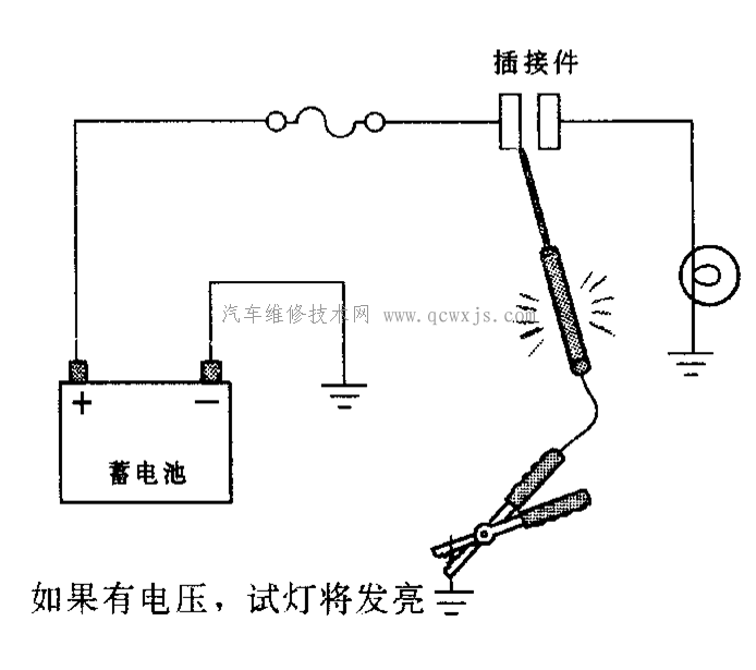 首先斷開(kāi)與電氣部件相連接的電源電路,將測(cè)試燈一端搭鐵,另一端接電路各接點(diǎn)(從電路首端開(kāi)始)。如果燈不亮,則斷路出現(xiàn)在被測(cè)點(diǎn)與搭鐵之間。