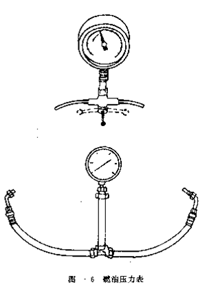 §燃油壓力表(如圖6所示)是用來檢測 燃油供給和噴射系統工作是否正常的。一般電控汽油噴射系統的供油總管上設的專用的油壓檢測 口,用以和燃油壓力表連接。