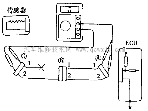 在各連接器接通的情況下,ECU輸出端子電壓為5 V的電路中,如果依次測量連接器A的端子1、連接器B的端子1和連接器C的端子1與車身(搭鐵)之間的電壓時,測得的電壓值分別為5 V、5 V和0 V,則可判定:在連接器B的端子1與連接器C的端子1之間的配線有斷路故障存在。