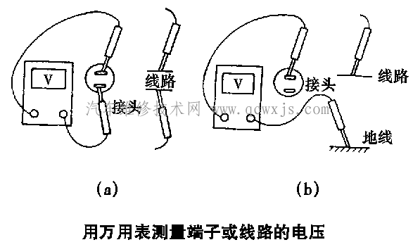 (9)測量兩個端子間或兩條線路間的電壓時,應將萬用表的2個表筆與被測的兩個端子或兩根導線接觸(圖a);測量某個端子或某條線路的電壓時,應將萬用表的正表筆與被測的端子或線路接觸,而將萬用表的負表筆與地線接觸(圖b)。