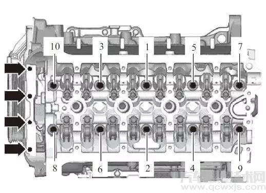 提示:旋出螺栓(箭頭),將氣缸蓋螺栓按1~10的順序旋松。