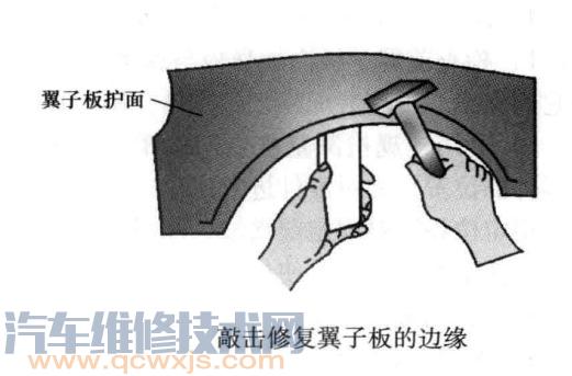 4)翼子板的邊緣處應用專用的墊鐵在里邊墊托,墊鐵的邊緣要對準彎折線,一手持錘在正面彎折線外緣敲擊,如圖所示。