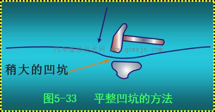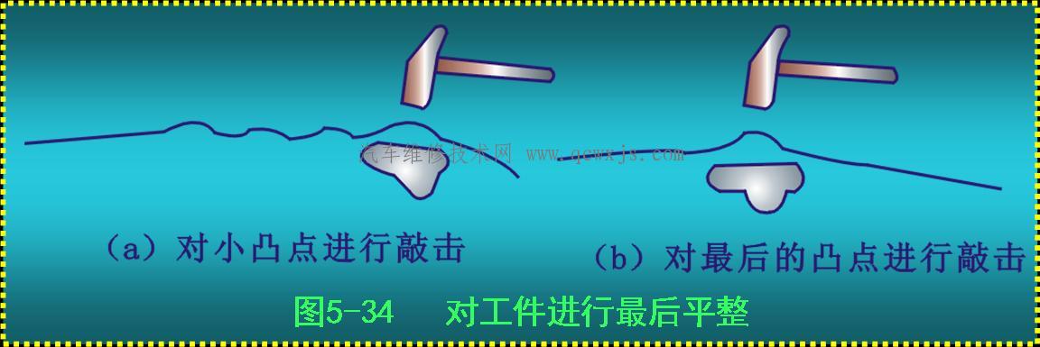 步驟4:大的凹陷被拉平之后,一些小的凹凸不平部分,就可以借助錘子與墊鐵進(jìn)行手工平整。如圖5-33所示。