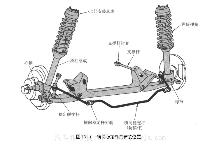 橫向穩定桿的作用是轉彎時防止車身過度傾斜以及提高汽車在不平路面上的行駛穩定性。橫向穩定桿是用彈簧鋼制成的扭桿彈簧,形狀呈“U”形,橫置在汽車的前端和后端。桿身的中部,用套筒與車架鉸接,桿的兩端分別固定在左右懸掛上。當車身只作垂直運動時,兩側懸掛變形相同,橫向穩定桿不起作用。當車身側傾時,兩側懸掛跳動不一致,橫向穩定桿發生扭轉,桿身的彈力成為繼續側傾的阻力,起到橫向穩定的作用。典型的橫向穩定桿的安裝位置如圖13-10所示。