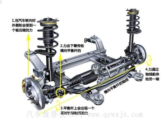 過彎時彎內輪的懸掛伸長而彎外輪的懸掛被壓縮,這時防傾桿就會產生扭轉抑制這種情況。它會對彎外輪的懸掛施一個向下壓的力量,而對彎內輪的懸掛施一個向上抬起的力量,施予左右懸掛的作用力是大小相等方向相反相互牽制的。太軟的防傾桿在獨立懸掛的車會造成過彎時過多的外傾角,減少輪胎的接地面積,太硬則是會造成輪胎無法緊貼地面,影響操控性。對彎內輪來說,防傾桿對車輪施的力和彈簧對車輪施的力是方向相反的,彈簧產生的力可把車輪壓回地面,而防傾桿卻會使它離開地面。假如防傾桿太硬會減少把車輪壓回地面的力,如果這種情況發生在驅動輪,可能會使得出彎加油時彎內輪的抓地力變小,造成輪胎的空轉。http://www.011315.cn