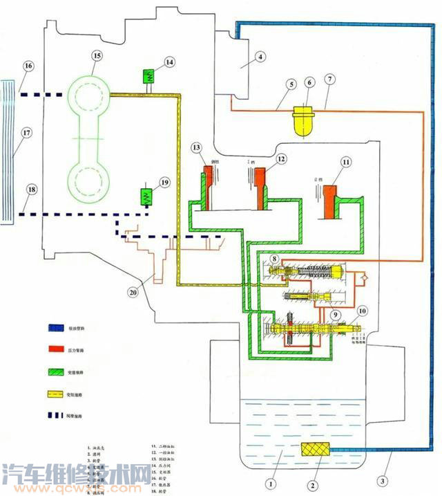 首先我們來看一下這種變速箱液壓系統示意圖以及油液的循環路線。