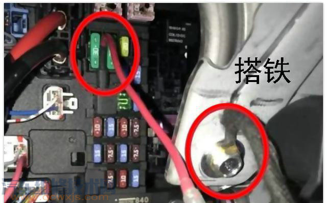 那么想要在熄火后讓行車記錄儀繼續運行,取電就要找到這些保險絲,用取電器原位插入后,準備兩個安數相當的保險絲插入取電器即可。負極可以直接就近與車架位置的金屬螺絲固定,車身金屬框架整體都是負極。
