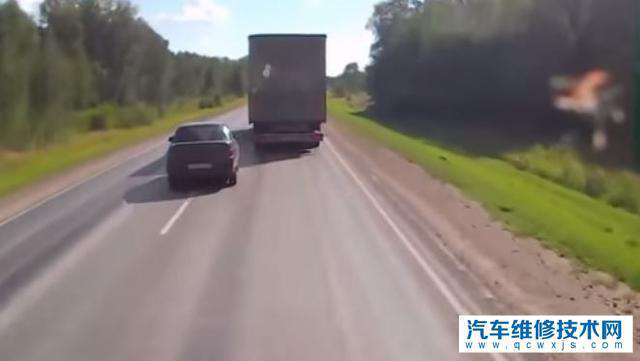 以前看過這樣一個視頻:小車想要超越前方的半掛車,結果就在小車快速接近時半掛車突然變道,小車趕緊急剎車,半掛車硬生生貼著小車完成變道,小車右側撞到了半掛車尾部。