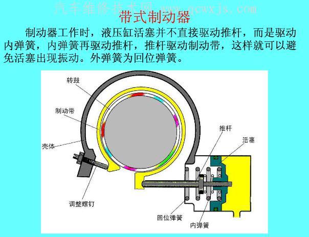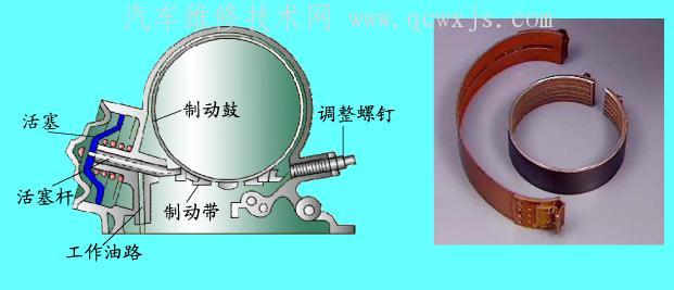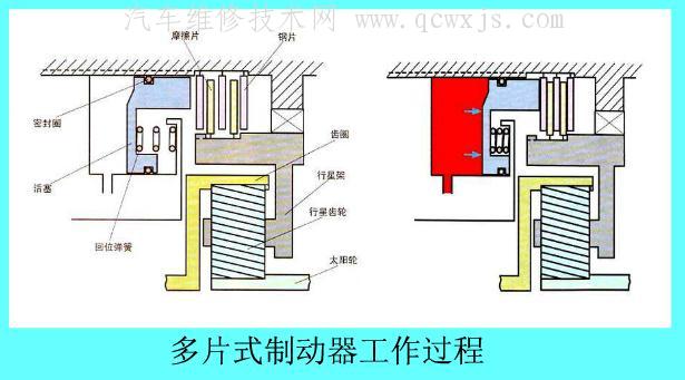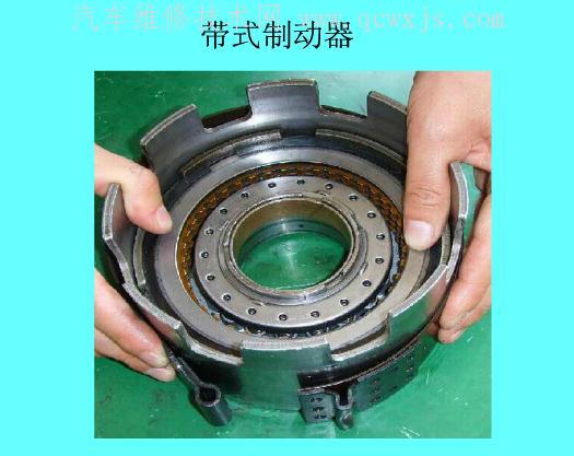 制動器將行星齒輪機構中的太陽輪、齒圈和行星架這3個基本元件之一與變速器殼體相連,使該元件被約束固定而不能旋轉。制動器的結構型式較多,目前最常見的是帶式制動器片式制動器兩種。