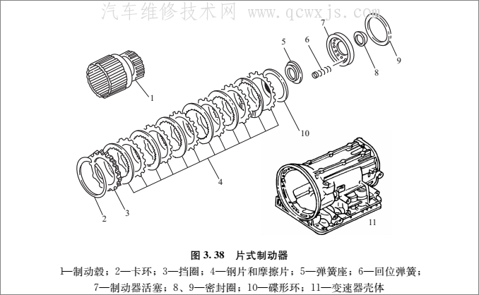 3. 38所示。鋼片4通過外花鍵齒安裝固定在變速器殼體11上的內花鍵齒圈中,摩擦片4則通過內花鍵齒和制動轂1上的外花鍵齒連接。