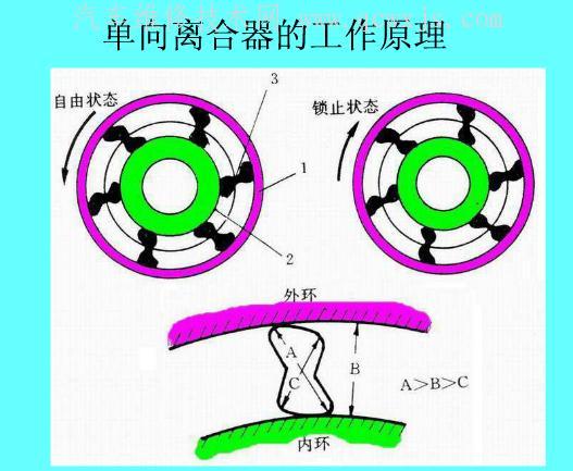 楔塊式單向離合器的鎖止方向取決于楔塊的安裝方向。維修時不可裝反,以免影響自動變速器的正常工作。