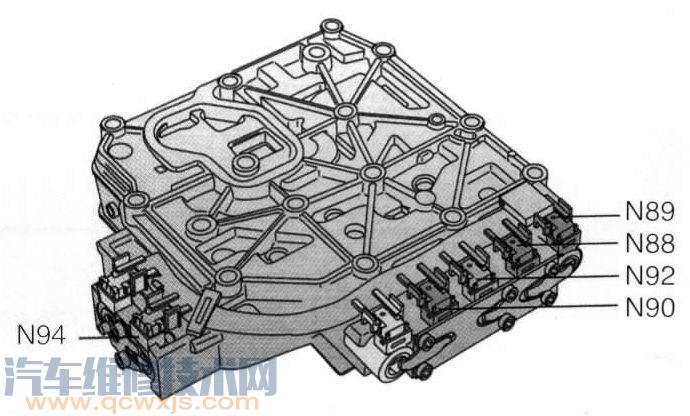 (2)元件作用:電磁閥N88、N89、N90、N92、N94是開關閥,開關閥的作用是可以打開或關閉某一油道,其中N88、N89、N90稱為換檔電磁閥,控制單元通過這三個閥,控制換檔液壓閥的動作而換入某個檔位。N92、N94稱為換擋平順閥,其作用是使換擋平順。