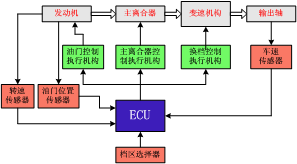 AMT工作時,電控單元(ECU)根據(jù)發(fā)動機(jī)轉(zhuǎn)速、油門位置、車速等信號控制離合器和變速機(jī)構(gòu)的動作,從而使傳統(tǒng)變速器中手動換擋變?yōu)樽詣踊瑘D顯示了其基本工作原理: