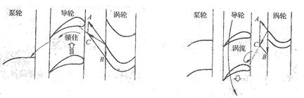 ,且傳動效率急劇下降,其原因在于導輪固定。當泵輪與渦輪的轉速差很大時,如圖3-10a所示,由于泵輪葉片外緣與渦輪葉片外緣的壓力差也很大,所以沿輪葉片流動的ATF速度A亦大。速度A在渦輪旋轉速度B(即ATF圓周運動速度)的影響下方向發生偏移,ATF實際上按速度C的方向流向導輪,沖擊導輪葉片前部。因導輪固定不動,所以促使ATF改變方向流向泵輪葉片背面,產生增扭的作用。當轉速差小時,如圖3-10b所示,渦輪轉速B增大,ATF速度A減小,ATF按速度C的方向流向導輪,沖擊導輪背面。若導輪不動。則ATF將產生渦流