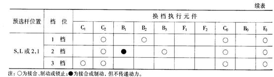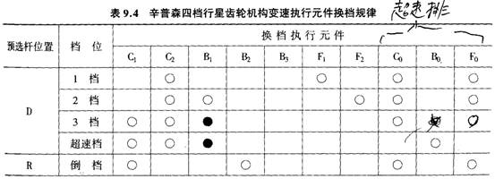 表9.3反映了辛普森行星齒輪機構變速器變速執行元件的工作規律。