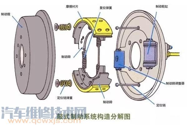 行車制動系由剎車踏板、剎車總泵、真空助力器、剎車油管、剎車分泵、盤式制動器(剎車盤、剎車鉗、剎車片)、鼓式制動器(剎車鼓、剎車蹄片、剎車片調整機構)等組成。