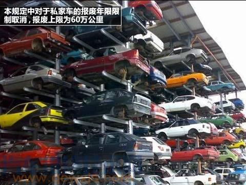 汽車報廢規定1、60萬公里強制報廢之前我國私家車報廢年限為15年,很多人就算15年也開不了幾十公里,被強制報廢的時候基本上還和新車一樣,很浪費!為了改善這一情況,我國頒發了新的私家車報廢規定,取消了強制報廢年限,改為跑滿60萬公里強制報廢,這樣一來就人性化多了,因為一輛車要是能跑到60萬公里也差不多該報廢了!2、連續3年不參加年檢強制報廢新規定出臺后,我國加大了年檢的重要性,車主必須要按時參加年檢,如果逾期未年檢,被抓到,將被扣分罰款,如果連續三年沒有參加年檢,汽車將被強制報廢!【汽車報廢補貼多少錢】汽車報廢補償標準2015年報廢汽車補貼政策:一、適當保持政策的連續性。根據補貼資金規模,繼續對達到汽車報廢標準、提前報廢更新的城市公交、農村客運車輛,以及提前報廢的重型載貨汽車給予資金補貼,以方便城鄉居民出行,推動貨運質量改善,維護廣大人民群眾的切身利益。二、合理調整車輛使用年限。為體現資源節約,適當延長了補貼車輛使用年限,將城市公交、農村客運、重型載貨汽車等補貼車輛的使用年限分別由7至9年、4至8年、7至9年調整為8年以上(含8年)、6年以上(含6年)、10年以上(含10年)且不到15年。三、適當提高資金補貼標準。為增強補貼政策的吸引力,參照汽車以舊換新的補貼標準,將城市公交、農村客運、重型載貨汽車的補貼標準分別由15000元、10000元、5000元調增到18000元、11000元、18000元。